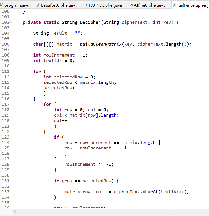 The rail fence cipher (also called a zigzag cipher) is a form of classical transposition cipher. It derives its name from the manner in which encryption is performed.